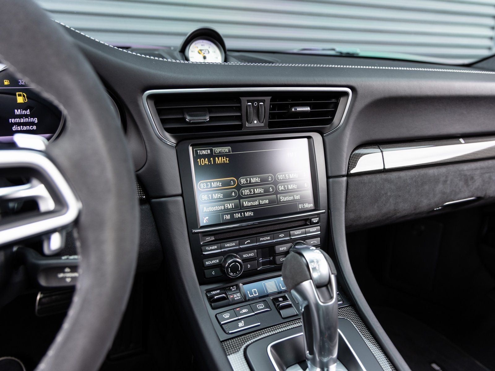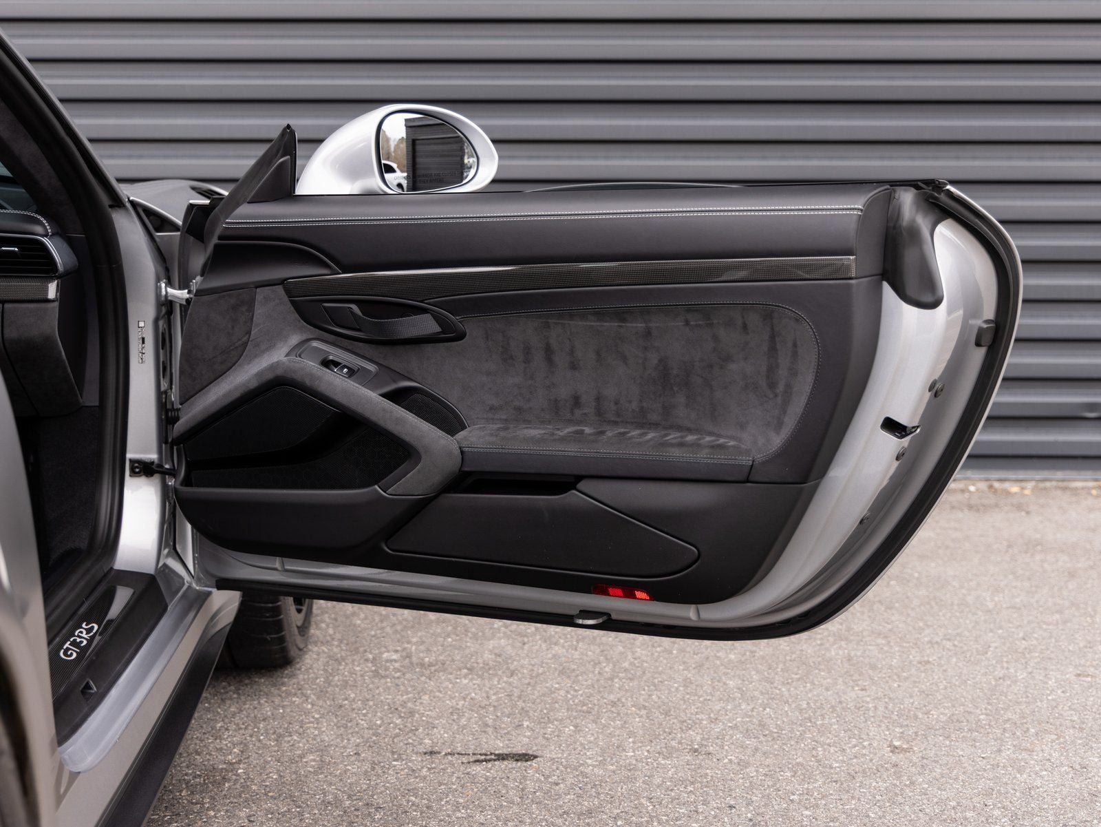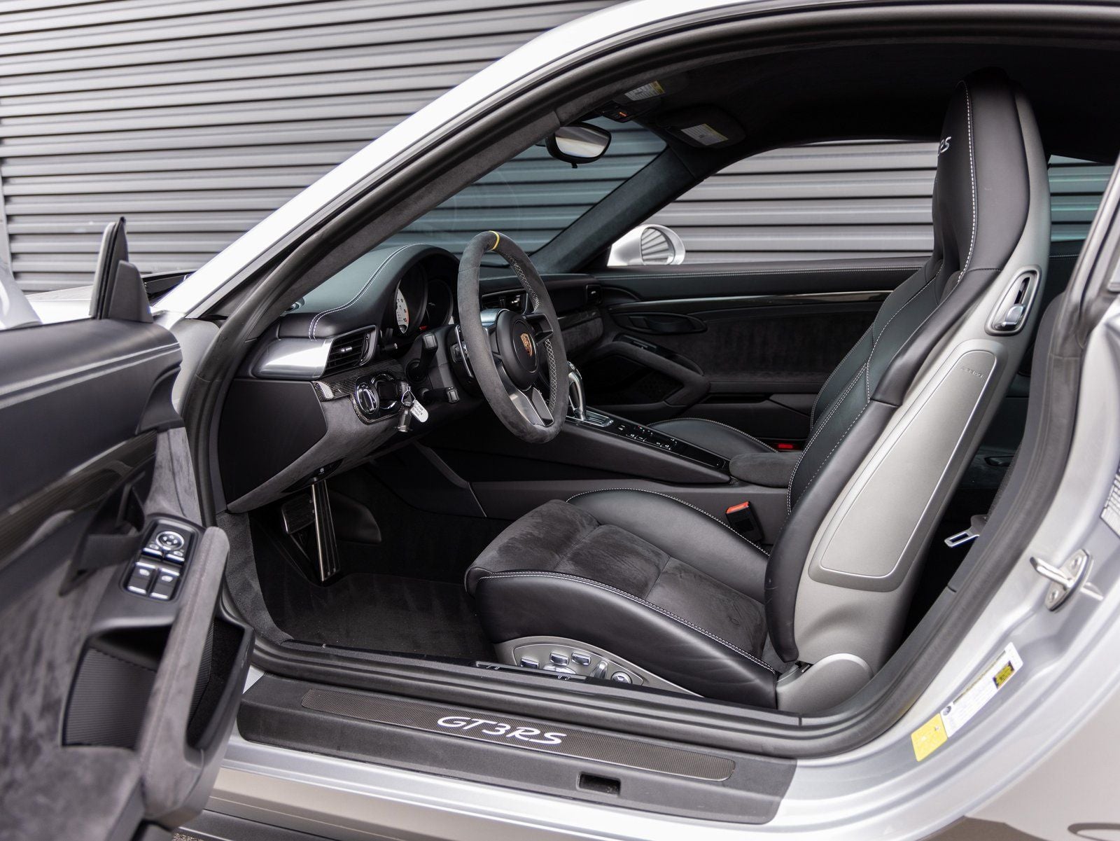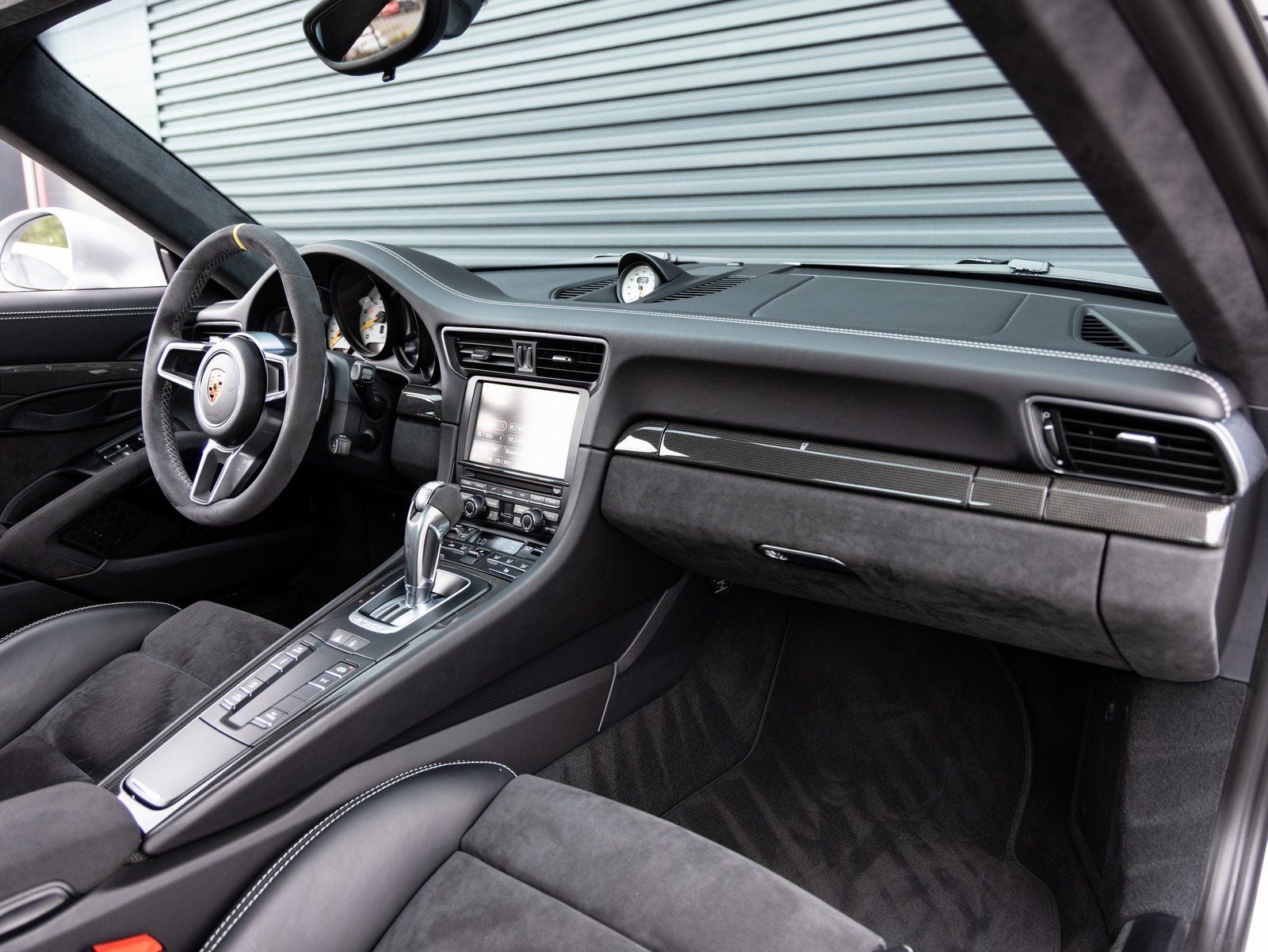 Inside, the cabin is designed for both performance and driver engagement. Highlights include Adaptive Sport Seats Plus (18-way) with Memory Package, Seat Heating, and distinctive motorsport details such as Instrument Dials in White and a Sport Chrono Clock Dial in White. Alcantara trimmed surfaces such as the Sun Visors and Door Panels in Leather and Alcantara enhance the purposeful interior atmosphere. Additional features include Door-Sill Guards in Carbon Fiber, Illuminated, a Leather Key Pouch, Floor Mats, and the Smoking Package.